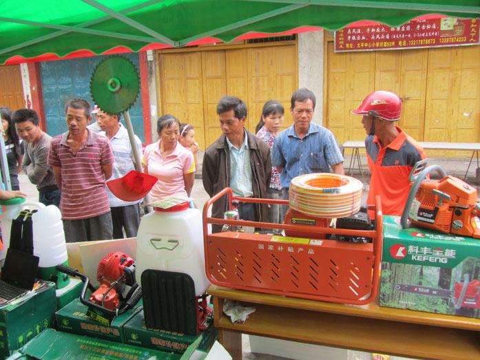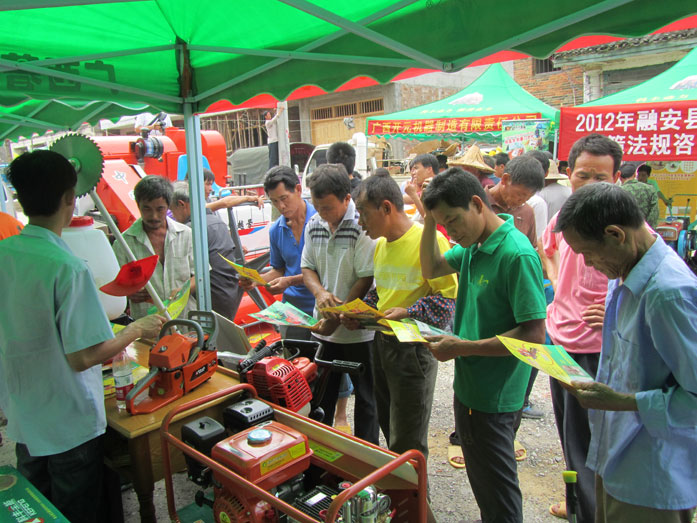 5月5日上午,2012年全國科技活動周廣西農(nóng)機化管理局小型適用農(nóng)機具巡回展示與技術(shù)培訓(xùn)啟動儀式在融安縣隆重舉行,為巡回系列活動拉開了序幕。此次活動領(lǐng)導(dǎo)相當(dāng)重視,廣西農(nóng)機化管理局、科教處、廣西農(nóng)機鑒定站、廣西農(nóng)機化技術(shù)推廣總站,柳州市農(nóng)機局,融安縣委常委、宣傳部、人民政府、縣人大,縣人民政府、縣政協(xié)等等領(lǐng)導(dǎo)出席了啟動儀式,期間我公司參展的農(nóng)機得到了出席領(lǐng)導(dǎo)的特別關(guān)注和認(rèn)可,同時現(xiàn)場民眾對科豐牌農(nóng)機也有強烈的購買興趣及意愿紛紛圍觀咨詢…….